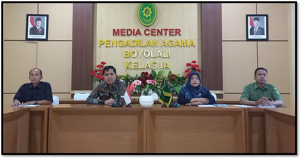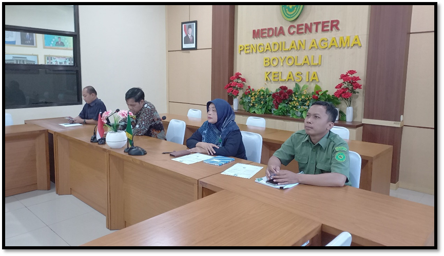 Bertempat di Ruang Media Center, Ketua Pengadilan Agama Boyolali Bapak Senen, S.Ag, M.H., bersama Panmud Hukum, Panmud Gugatan dan Staf Kepaniteraan PA Boyolali menghadiri kegiatan Zoom Meeting Sosialisasi Penerbitan Salinan Putusan dan Akta Cerai di lingkungan peradilan agama yang diselenggarakan oleh Direktorat Jenderal Badan Peradilan Agama (Ditjen Badilag) Mahkamah Agung RI, pada hari Selasa, 01 Juli 2025 pukul 09.00 WIB. Sosialisasi ini bertujuan memberikan pemahaman teknis dan prosedural terhadap sistem EAC sebagai bagian dari upaya transformasi digital di lingkungan peradilan agama. Narasumber dari Ditjen Badilag menjelaskan bahwa implementasi EAC akan mempercepat pelayanan pencetakan dan penerbitan akta cerai secara digital.