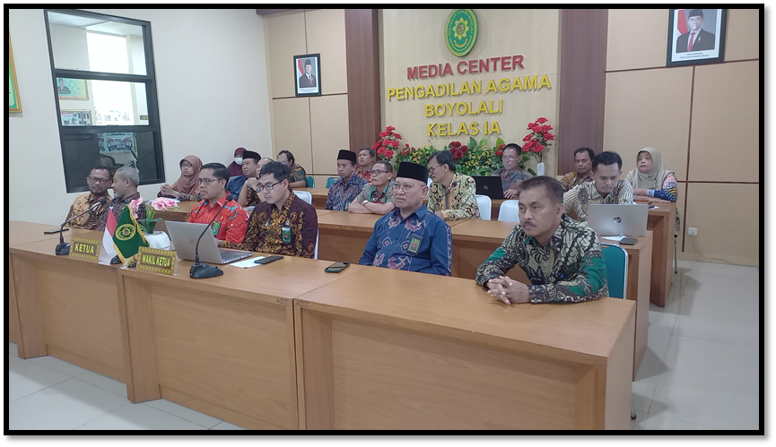 Boyolali, 24 Juli 2025 — Pukul 13.00 WIB bertempat di Ruang Media Center, Ketua Pengadilan Agama Boyolali Senen, S.Ag., M.H. di dampingi Wakil Ketua Dr. Jamadi, Lc, M.E.I., para Hakim, Plh. Panitera dan Sekretaris serta seluruh pegawai PA Boyolali mengikuti kegiatan Pembinaan terkait Kode Etik Hakim & ASN serta Evaluasi SAKIP secara daring melalui Zoom meeting, yang diselenggarakan oleh Pengadilan Tinggi Agama (PTA) Semarang, dengan narasumber dari Badan Pengawas Mahkamah Agung RI.