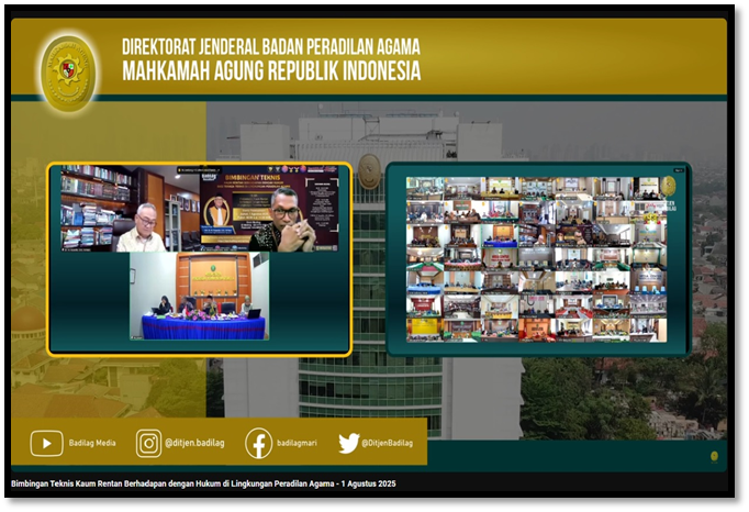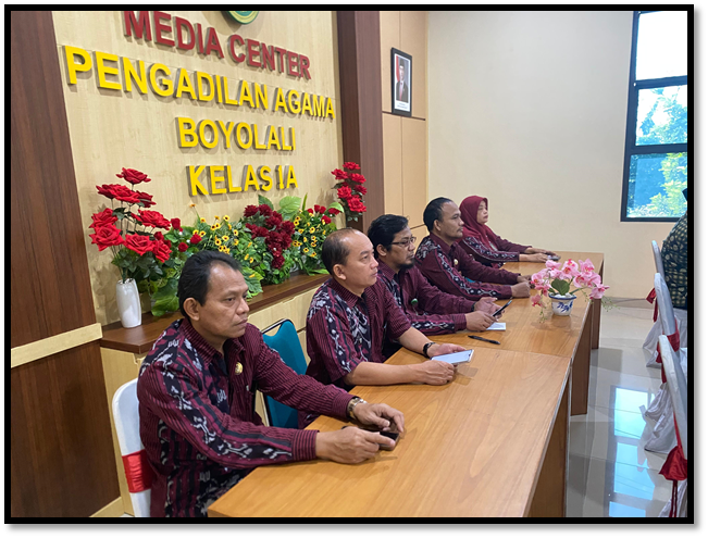 Bertempat di ruang Media Center Pengadilan Agama Boyolali, Ketua Pengadilan Agama Boyolali Bapak Senen, S.Ag, M.H., bersama Wakil Ketua, para Hakim, dan Seluruh Tenaga Teknis Pengadilan Agama Boyolali mengikuti Bimbingan Teknis yang diselenggarakan oleh Direktorat Jendral Badan Peradilan Agama secara virtual (zoom), Jumat, 01 Agustus 2025. Adapun tema Bimtek tersebut “Problematika Kaum Rentan Berhadapan dengan Hukum di Lingkungan Peradilan Agama". Bimtek ini diikuti oleh satuan kerja peradilan agama dari seluruh Indonesia. Kegiatan ini bertujuan meningkatkan kapasitas tenaga teknis dalam menangani perkara yang melibatkan kelompok rentan seperti perempuan, anak, penyandang disabilitas, dan masyarakat miskin.