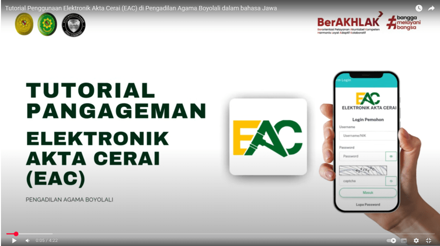 - Video Tutorial Penggunaan Elektronik Akta Cerai (EAC) di Pengadilan Agama Boyolali dalam bahasa Jawa : https://www.youtube.com/watch?v=6R-6UuEllpA