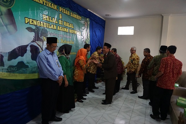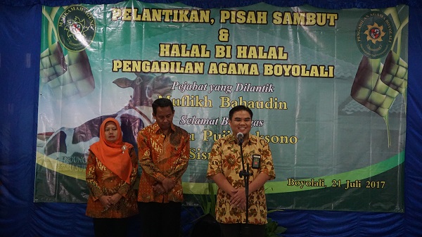 Maka Pada hari Jum’at tanggal 21 Juli 2017 dilaksanakanlah acara Pelantikan dan Pisah Sambut Pegawai oleh Ketua PA Boyolali Bp. Drs. Syamsul Aziz, MH, beliau yang melantik langsung Kasubbag Perencanaan, IT dan Pelaporan yang baru yaitu Bp. Muflikh Bahaudin turut hadir tamu undangan rombongan pengantar dari PA Surakarta, segenap karyawan dan ibu dharmayukti PA Boyolali. Acara dilanjutkan sekaligus perpisahan Sdr. Sismanto yang sebelunya bertugas di PA Boyolali IB sebagai Staff Kepaniteraan dimutasi ke PA Pati Kelas IA sudah pada beberapa bulan sebelumnya.