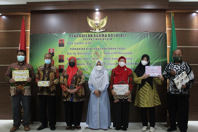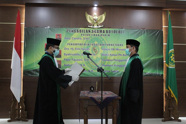 Hari Jumat, 27 Agustus 2021, Pengadilan Agama Boyolali melaksanakan Pengambilan Sumpah Jabatan dan Pelantikan Bapak Hary Candra, S.H.I. sebagai Hakim Pengadilan Agama Boyolali Kelas IB yang sebelumnya menjabat  sebagai Hakim Pengadilan Agama Soreang Kelas II. Dilanjutkan dengan prosesi Pengantar Alih Tugas yakni Bapak Syahruddin, S.H.I., M.H. menjadi Wakil Ketua Pengadilan Agama Barru Kelas II. Ibu Dra. Hj. Emi Suyati menjadi Hakim Pengadilan Agama Wonosobo kelas IA, Bapak Saiful Rijal, S.H. menjadi Panitera Pengganti Pengadilan Agama Salatiga Kelas IB. Ibu Fajar Fauzani, S.H.I. sebagai Panitera Pengganti Pengadilan Agama Bantul Kelas IB. Dan terakhir, prosesi Purna Tugas yaitu Bapak Bambang Sutiyo, S.H.