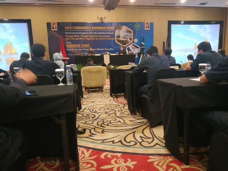 Rapat Koordinasi dan bimbingan Teknis “Perencanaan Anggaran dan Akuntabilitas Kinerja” Pengadilan Tinggi Agama Semarang dan Pengadilan Agama Se Jawa Tengah Rapat ini dilaksanakan pada Hari Rabu 27 - Jumat 29 Oktober 2021 di Sunan Hotel Solo. Diikuti oleh para Sekretaris dan Kasubag Perencana, Teknologi Informasi dan Pelaporan dari seluruh Pengadilan Agama se Jawa Tengah, acara dibuka oleh Wakil Ketua Pengadilan Tinggi Agama Semarang beserta Sekretaris Pengadilan Tinggi Agama Semarang dan dihadiri oleh seluruh Ketua Pengadilan Agama se-Solo Raya.
