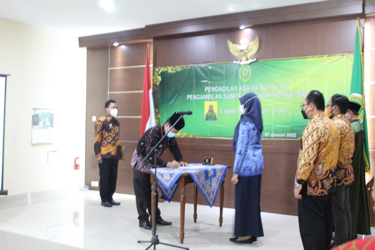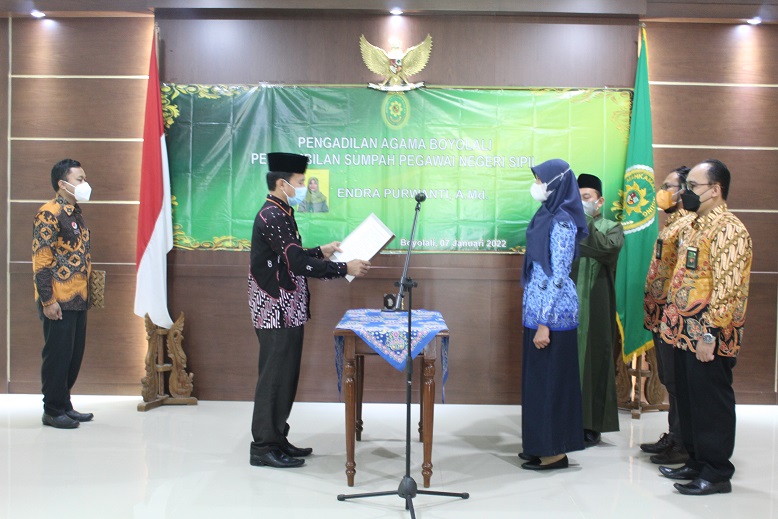 Warta PA Boy – Jumat, 07 Januari 2022, bertempat di Ruang Sidang Utama Pengadilan Agama Boyolali, Ketua Pengadilan Agama Boyolali, Bapak Eldi Harponi, S,Ag., M.H. melantik dan mengambil sumpah jabatan Saudari Endra Purwanti, A.Md. sebagai Pegawai Negeri Sipil (PNS) pada Pengadilan Agama Boyolali.