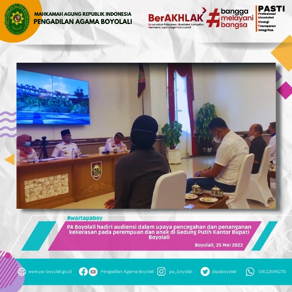 Pengadilan Agama Boyolali menghadiri acara audiensi dalam upaya pencegahan dan penanganan kekerasan pada perempuan dan anak, Rabu (25/05). Acara berlangsung di Gedung Putih Kantor Bupati Kab. Boyolali yang membahas keterkaitan dengan kepentingan perempuan dan anak di Kabupaten Boyolali. Kenapa dibahas?? Karena adanya kasus kekerasan pada perempuan dan anak tahun 2020-2021 diantara dengan jenis kasus pelecehan seksual/persetubuhan, kenakalan anak, KDRT (psikis, fisik, ekonomi), dan kekerasan fisik, psikis, penelantaran pada anak. Pada tahun 2020-2021 yang mendominasi kasus kekerasan paling tinggi adalah pelecehan seksual/persetubuhan.