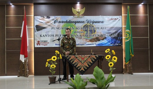 Jumat, 10 Juni 2022 bertempat di ruang Sidang Utama, Pengadilan Agama Boyolali dan Kantor Pertanahan Kabupaten Boyolali bersinergi dan melaksanakan kerjasama dalam hal peningkatan pelayanan terhadap masyarakat kabupaten Boyolali. Acara diawali dengan Menyanyikan Lagu Indonesia Raya dan dilanjutkan dengan Doa bersama. Dibuka oleh sambutan ketua Pengadilan Agama Boyolali Eldi Harponi, S.Ag., M.H. dengan rasa syukur serta bangga bisa melakukan kerja sama ini untuk kepentingan bersama. Tanda tangan kerjasama dilakukan Ketua Pengadilan Agama Boyolali Eldi Harponi, S.Ag., M.H. serta Kepala Kantor Pertanahan Kabupaten Boyolali Priyanto, A.Ptnh., M.M. disaksikan tamu undangan serta para Pejabat Fungsional dan Struktural Pengadilan Agama Boyolali di Ruang Sidang Utama Pengadilan Agama Boyolali.