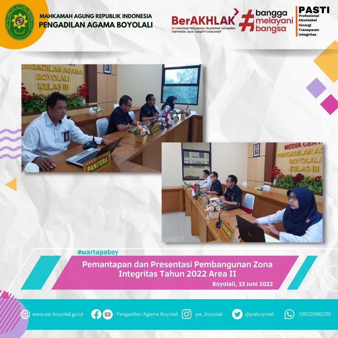 Acara tersebut dihadiri oleh Ketua PA Boyolali BapakEldi Harponi, S.Ag., M.H, Wakil Ketua PA Boyolali selaku Ketua Pembangunan Zona Integritas Bapak Muadz Junizar, S.Ag., M.H, didampingi Sekretaris Ibu Fitri Sayekti, S.T., S.H., M.M, dan Ketua Koordinator Area II beserta anggota. Koordinator area yang belum mendapatkan jadwal presentasi beserta anggota mengikuti acara tersebut melalui daring atau zoom meeting, Senin (13/06).