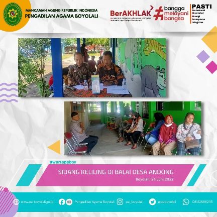 Pengadilan Agama Boyolali memberikan layanan prima dengan Sidang Keliling di Desa Andong, Kecamatan Andong, Kabupaten Boyolali, Jumat (24/06). Bertempat di Aula Balai Desa Andong, Sidang dipimpin oleh Wakil ketua Pengadilan Agama Boyolali Muadz Junizar, S.Ag., M.H. dengan Hakim Anggota Drs. Saefudin, M.H. dan Noor Ahmad Rosyidah, S.H.I. serta Panitera Pengganti Achmad Jawahir, S.H.I. Pelayananan sidang keliling kali ini menyidangkan total 6 perkara Cerai Talak dan Cerai Gugat dengan rincian putus 5 perkara dan 1 perkara belum putus, di tunda tgl 6 Juli 2022.