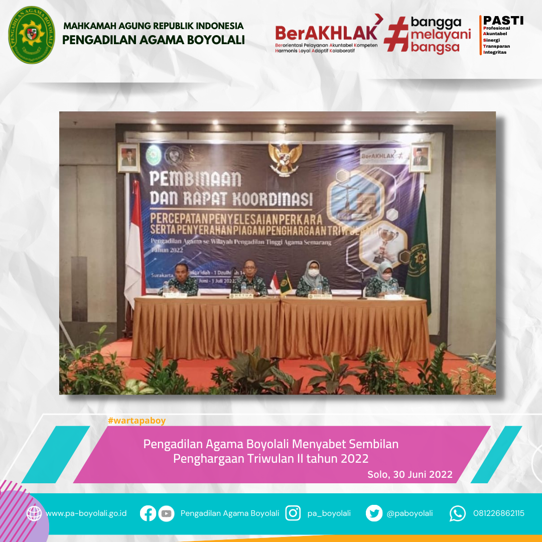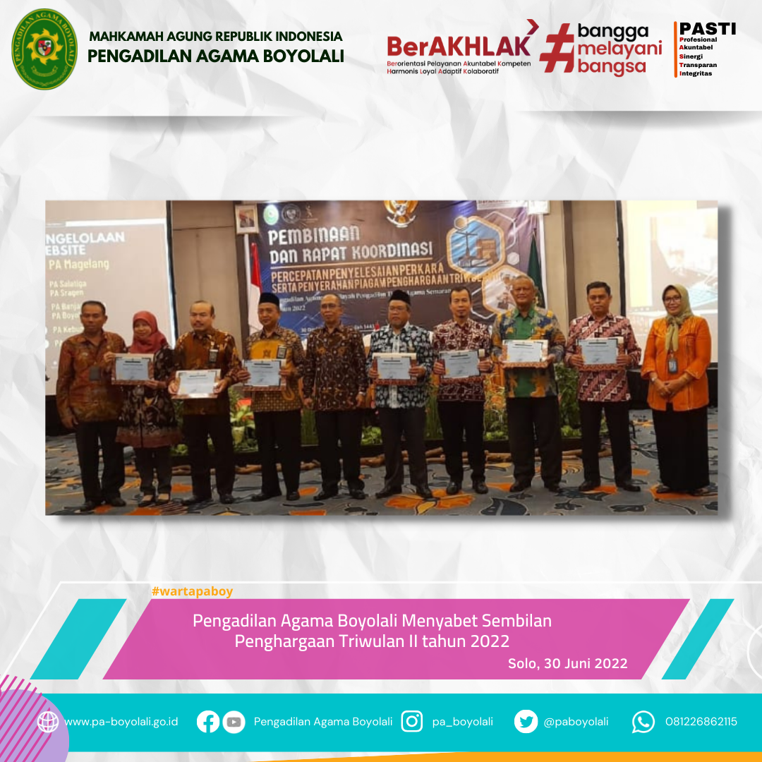 Pengadilan Agama Boyolali Menyabet 9 (Sembilan) Penghargaan Triwulan II Tahun 2022