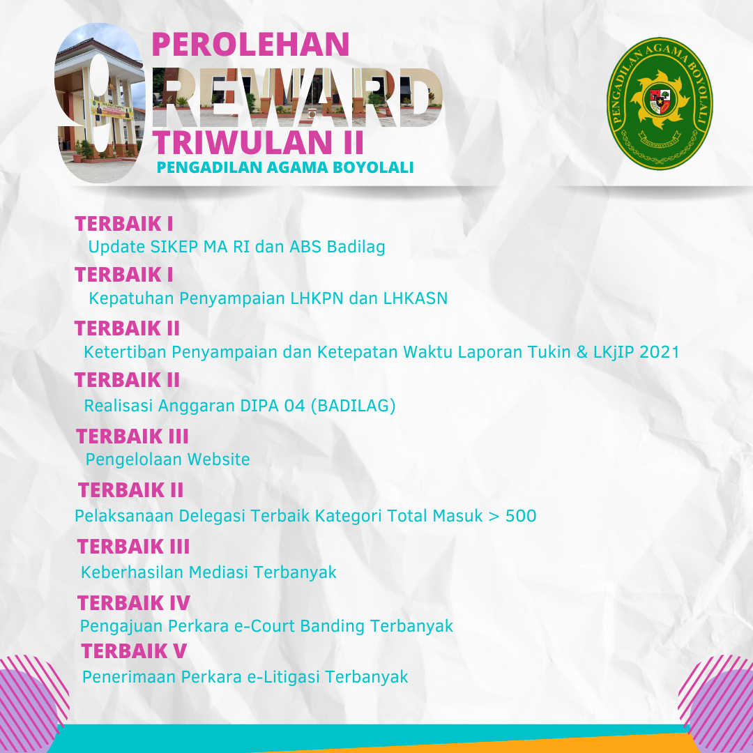 Menjadi kebanggan tersendiri bagi Pengadilan Agama Boyolali berhasil mendapatkan Sembilan penghargaan. Berikut penghargaan yang diraih oleh PA Boyolali :
