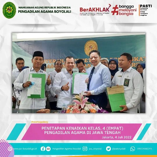 Alhamdulillah, Dalam rapat tersebut diserahkan Surat Keputusan Sekretaris Mahkamah Agung Republik Indonesia Nomor : 810/SEK/SK/VI/2022 tentang pemberlakuan peningkatan kelas Pengadilan Agama Boyolali, secara resmi Pengadilan Agama Boyolali naik kelas menjadi Pengadilan Agama Boyolali Kelas IA.