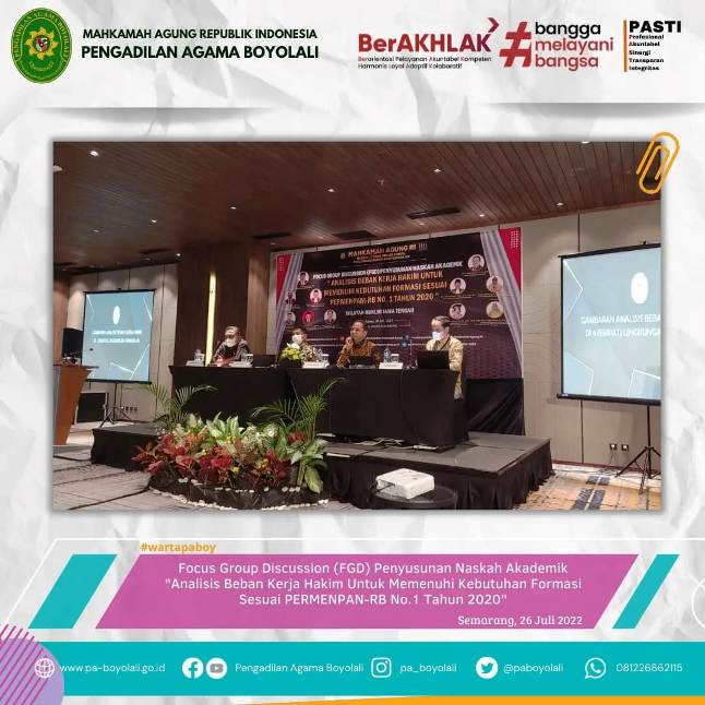 Bertempat di Hotel Aruss Semarang, Wakil Ketua PA Boyolali Muadz Junizar, S.Ag., M.H. didampingi Hary Candra, S.H.I selaku Hakim PA Boyolali menghadiri Focus Group Discussion (FGD) Penyusunan Naskah Akademik dengan topik "Analisis Beban Kerja Hakim Untuk Memenuhi Kebutuhan Formasi Sesuai PERMENPAN-RB No. 1 Tahun 2020" di Wilayah Hukum Jawa Tengah yang diikuti Hakim di 4 (empat) lingkungan peradilan, Selasa (26/07). Kegiatan ini diselenggarakan oleh Puslitbang Diklat Kumdil MA RI di beberapa daerah termasuk Jawa Tengah. Diikuti oleh 34 peserta dari 4 lingkungan peradilan di wilayah Jateng.