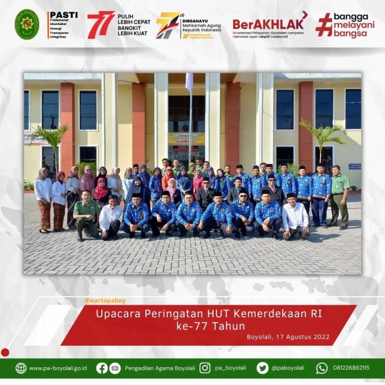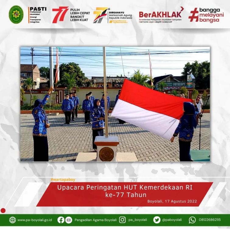Upacara Peringatan Hari Ulang Tahun Kemerdekan Republik Indonesia yang ke-77 berlangsung meriah dan hikmat. Bertempat di halaman depan kantor Pengadilan Agama Boyolali, Upacara tersebut dipimpin Wakil Ketua Pengadilan Agama Boyolali Muadz Junizar, S.Ag., M.H. dan di Komandani oleh Petugas Keamanan Pengadilan Agama Boyolali Maryanto.