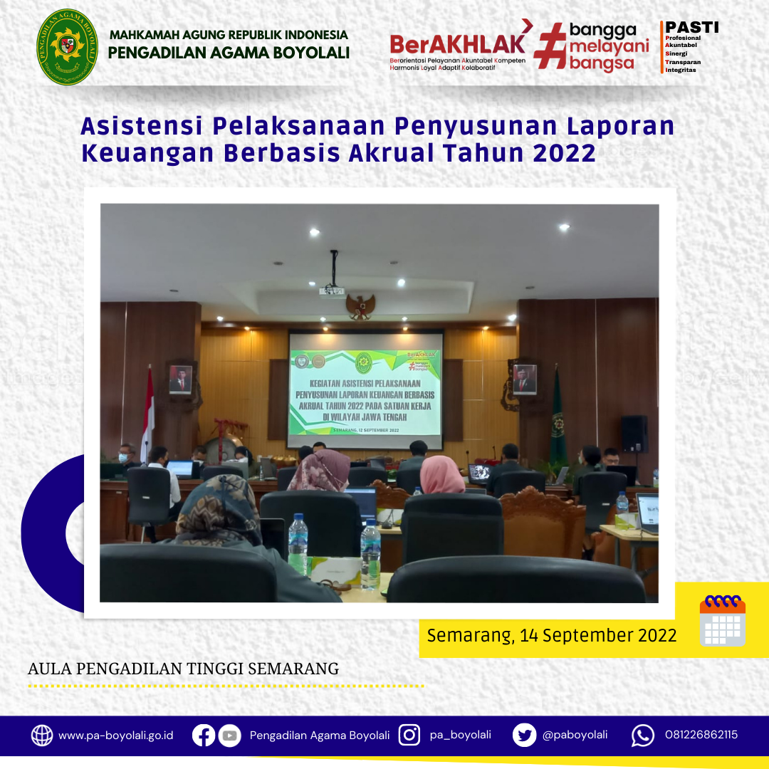 Semarang, 14 September 2022 Pengadilan Agama Boyolali Kelas IA dalam hal ini diwakili 2 (dua) Staff Umum dan Keuangan yaitu Aida Nur Santi, S.H yang bertindak sebagai operator Modul GLP dan Endra Purwanti, A.Md yang bertindak sebagai operator Modul Aset pada aplikasi SAKTI mengikuti kegiatan Asistensi Pelaksanaan Penyusunan Laporan Keuangan Berbasis Akrual Tahun 2022 pada satuan kerja di Jawa Tengah yang dilaksanakan di Pengadilan Tinggi Semarang.