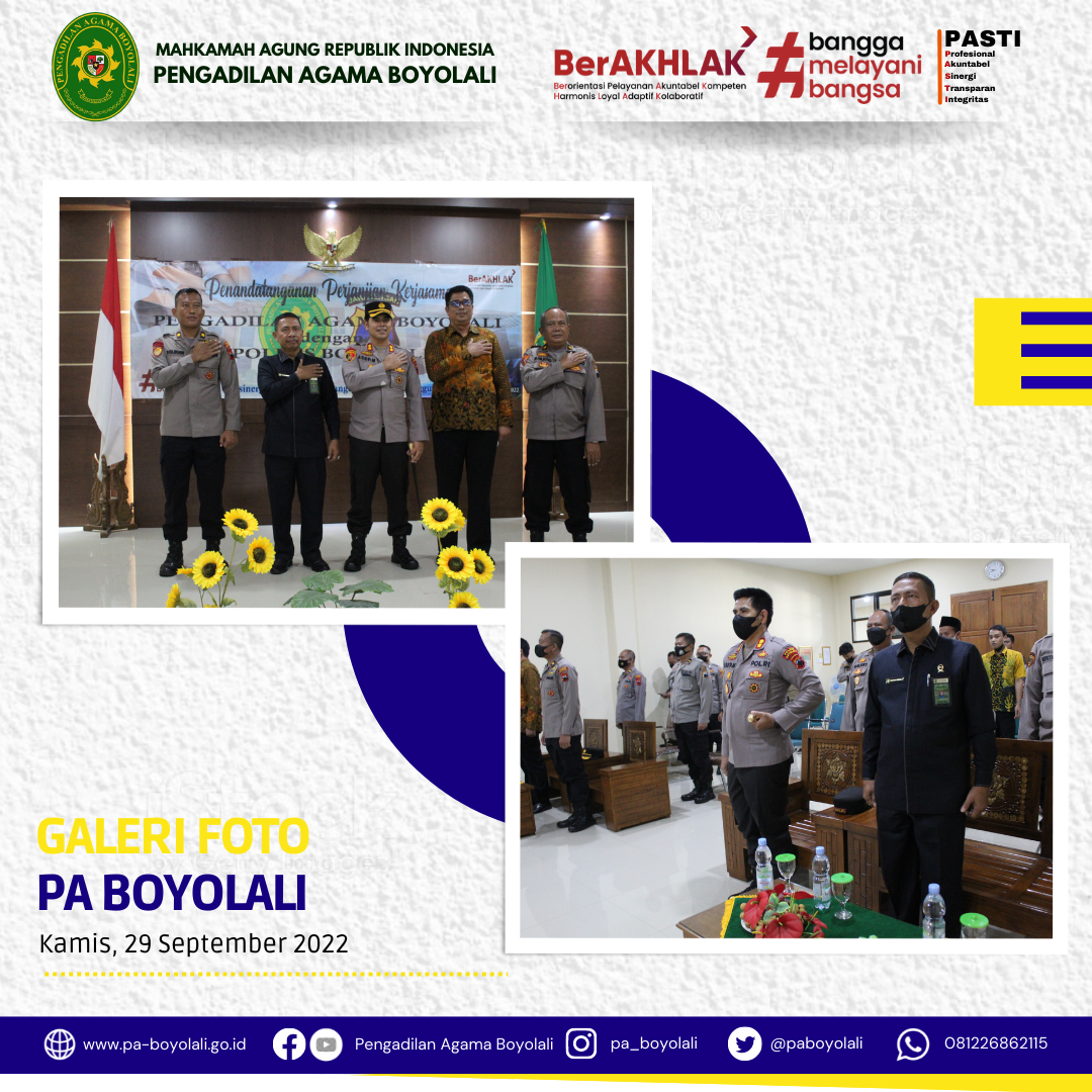 Kamis, 29 September 2022 pukul 09.00 WIB bertempat di ruang Sidang Utama Pengadilan Agama Boyolali Kelas IA telah dilaksanakan acara penandatanganan Memorandum of Understanding (MoU) antara Pengadilan Agama Boyolali Kelas IA dengan Polres Boyolali.