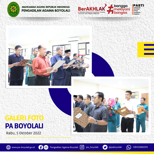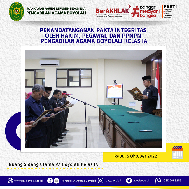 Pengadilan Agama Boyolali Kelas IA melaksanakan kegiatan Pengucapan dan Penandatangan Pakta Integritas yang dilaksanakan di hadapan Ketua Pengadilan Agama Boyolali, Bapak Drs. Media Rinaldi, M.A. Untuk pengucapan dan penandatanganan pakta integritas ini dilakukan oleh Hakim, Karyawan Karyawati, dan PPNPN Pengadilan Agama Boyolali.