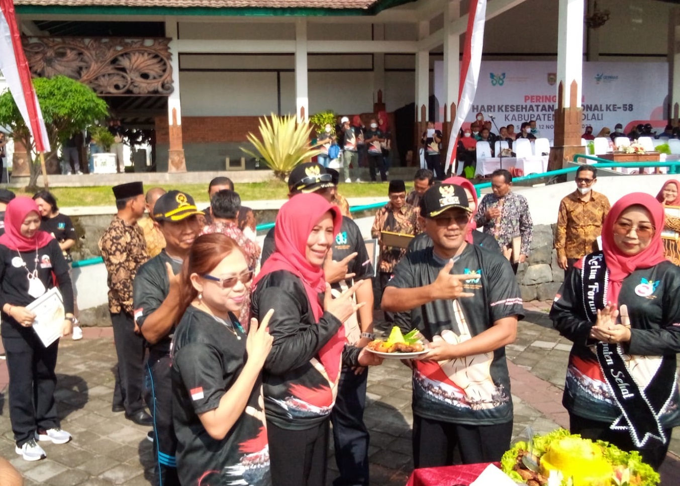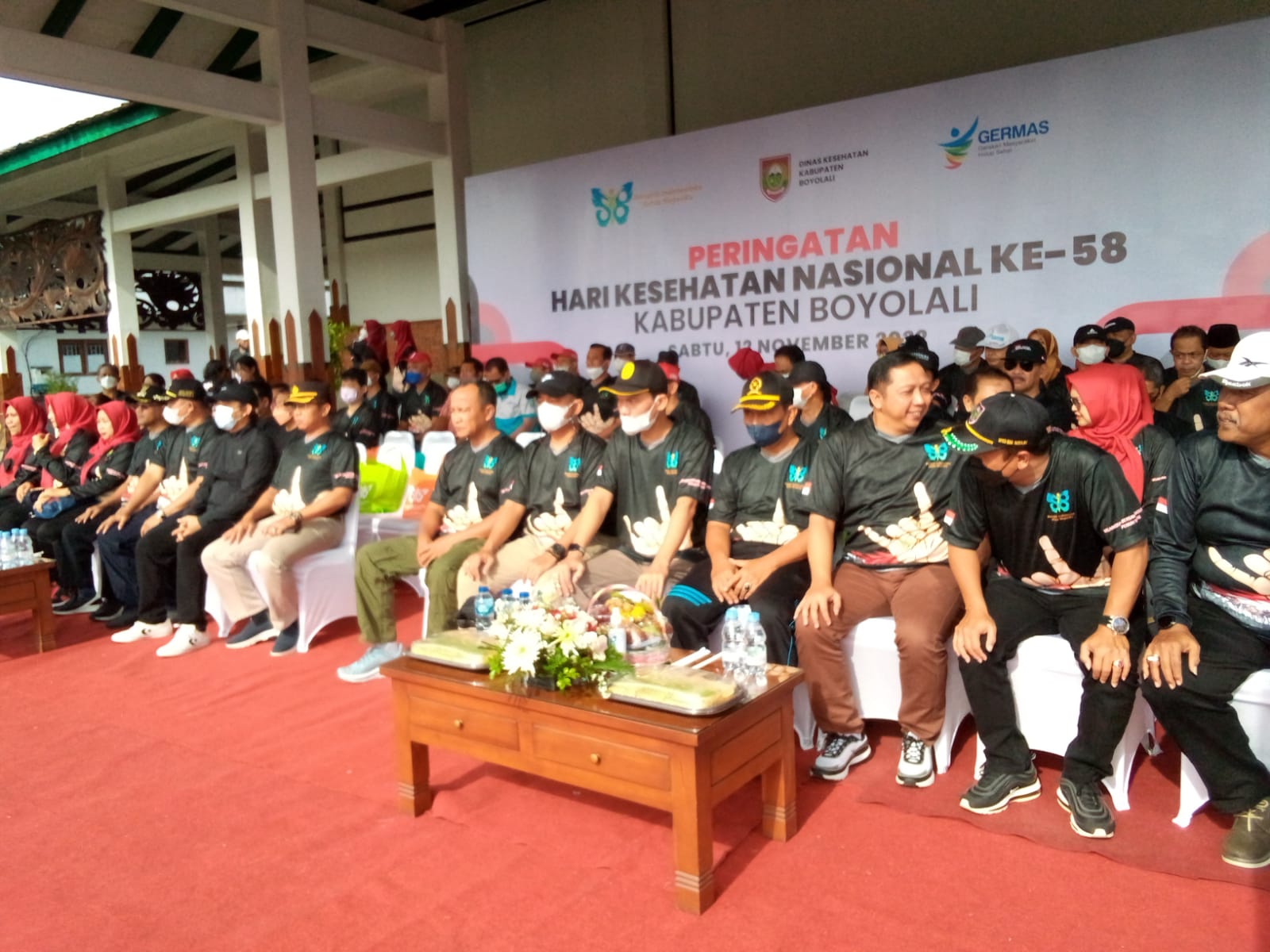 Peringatan Hari Kesehatan Nasional ke 58 pada tahun ini bertema “Bangkit Indonesiaku, Sehat Negeriku”. Pada puncak peringatan di Kabupaten Boyolai, acara peringatan Harkesnas ke 58 dimulai pada jam 07:15 wib sampai selesai, dengan susunan Acara yang diawali dengan Apel bersama, dilanjutkan dengan Penyerahan Sertifikat Kampung Germas , Launching Inovasi Pencegahan dan Penanganan Stunting, Penyematan PIN dan Slayer Kabupaten Sehat dan berakhir dengan Pembagian Hadiah dan Hiburan.