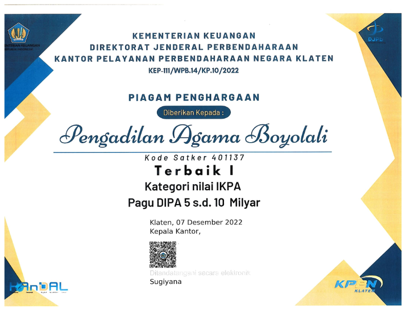 Dalam acara tersebut, Pengadilan Agama Boyolali mendapatkan 2 (Dua) penghargaan yaitu: