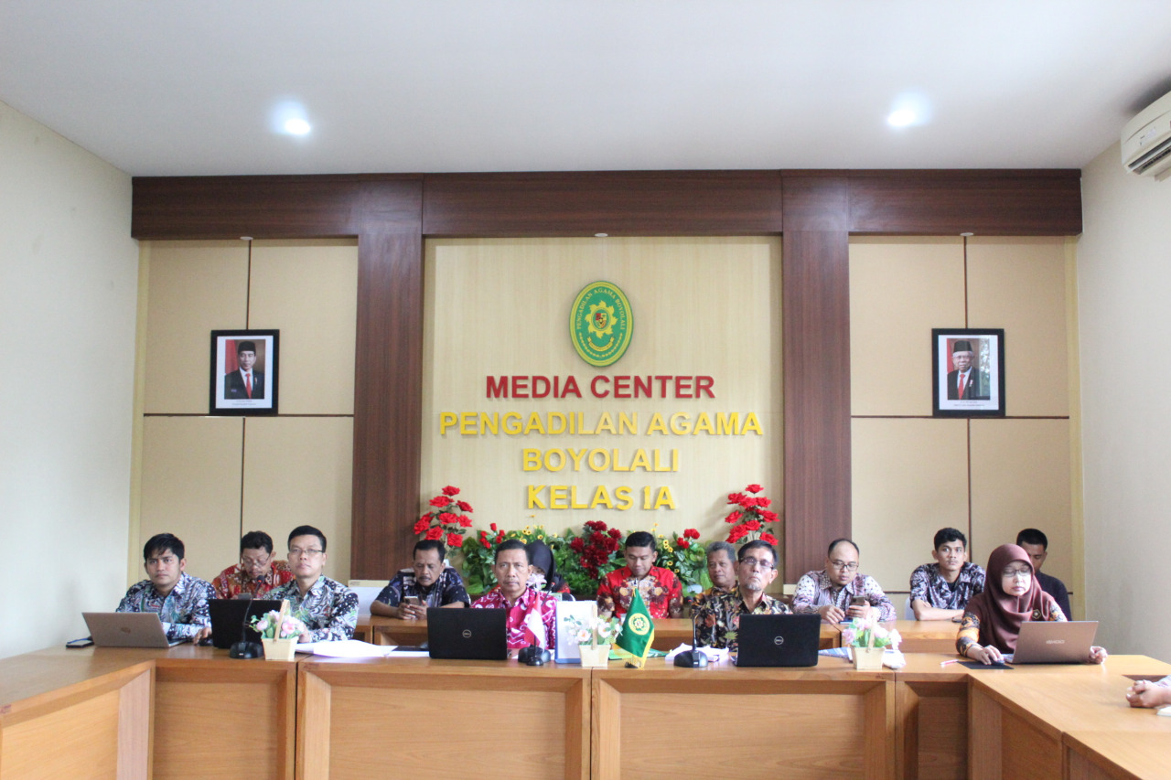 Boyolali, Jumat, 20 Januari 2023 pada pukul 09.00 s.d. 10.30 WIB, bertempat di Ruang Media Center Pengadilan Agama Boyolali yang dihadiri oleh Drs. Media Rinaldi, M.A. (Ketua PA Boyolali), Ibu  Rogaiyah  S.Ag., M.H. (Wakil Ketua PA Boyolali) Bapak Drs. Aziz Nur Eva (Panitera PA Boyolali) serta Ibu Fitri Sayekti, ST .,SH.,MM. (Sekretaris PA Boyolali) serta jajaran Pegawai baik Fungsional maupun Struktural dan Mahasiswa PPL di Pengadilan Agama Boyolali.