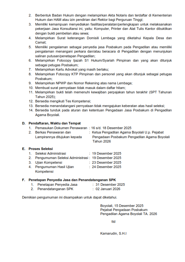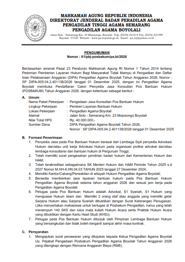 Berdasarkan amanat Pasal 23 Peraturan Mahkamah Agung RI Nomor 1 Tahun 2014 tentang Pedoman Pemberian Layanan Hukum Bagi Masyarakat Tidak Mampu di Pengadilan dan Daftar Isian Pelaksanaan Anggaran (DIPA) Pengadilan Agama Boyolali Tahun Anggaran 2026, Nomor : SP DIPA-005.04.2.401138/2026 tanggal 01 Desember 2025, dengan ini Pengadilan Agama Boyolali membuka Pendaftaran Calon Penyedia Jasa Konsultan Pos Bantuan Hukum (POSBAKUM) Tahun Anggaran 2026.